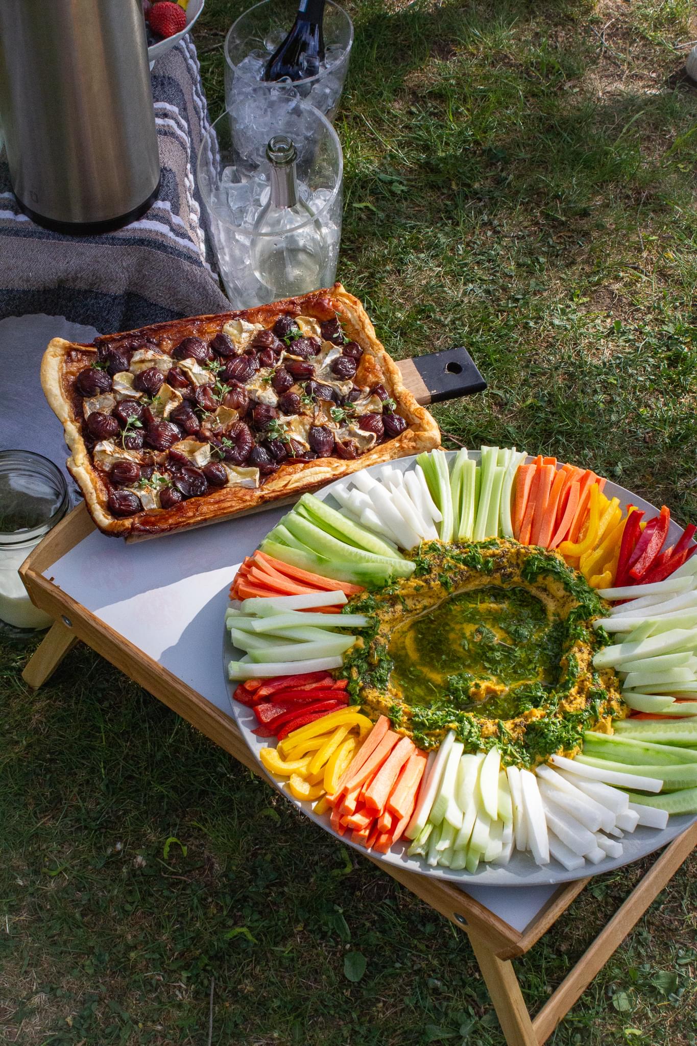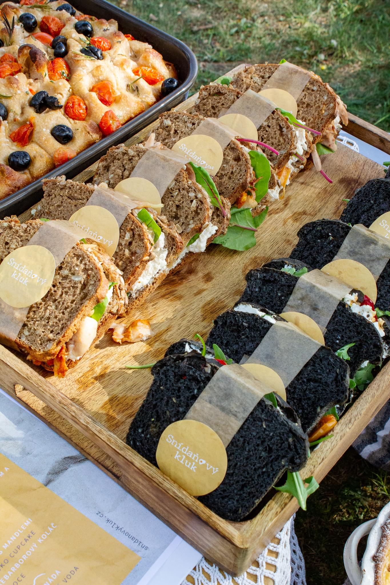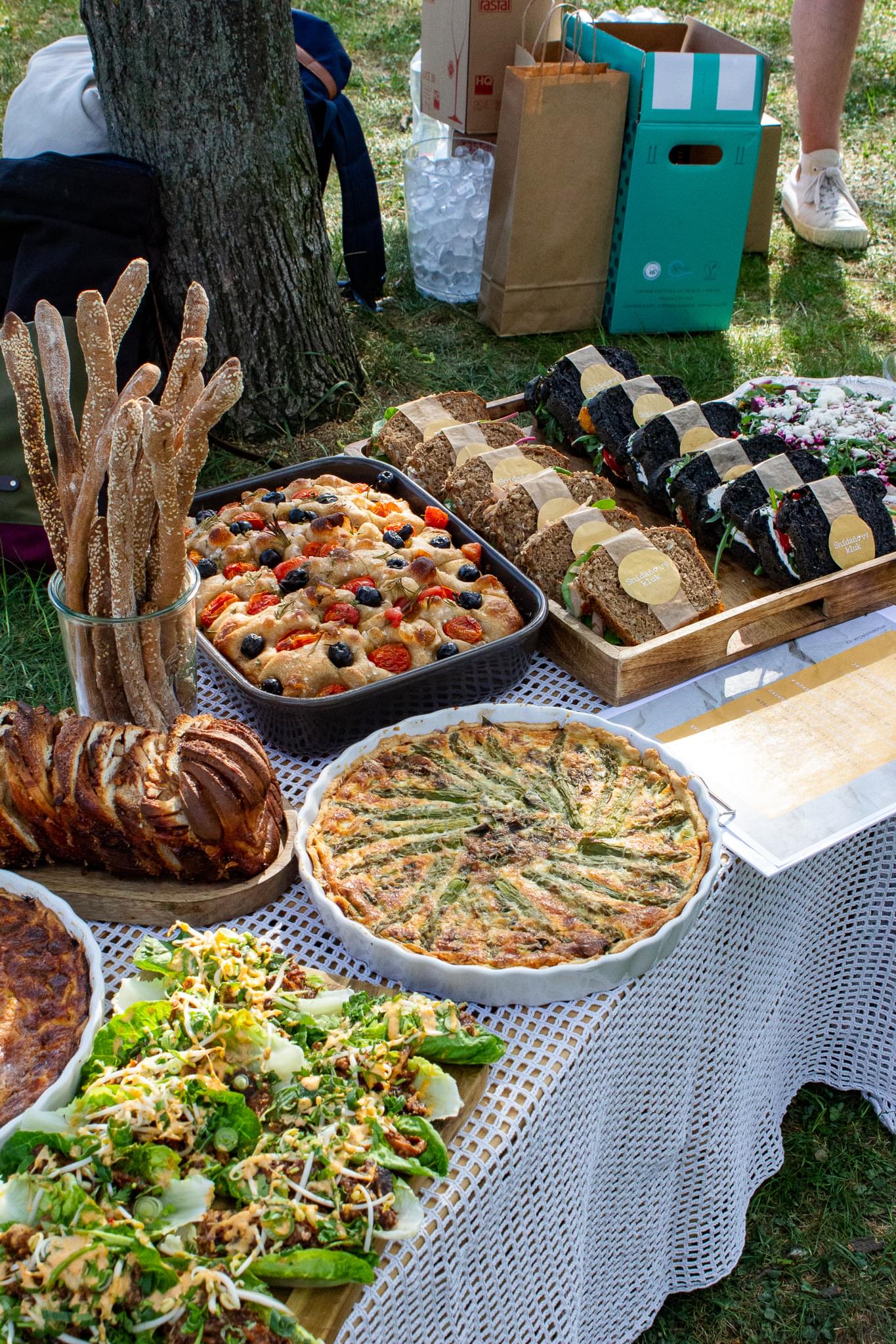 Z již výše zmíněných důvodů jsem se tedy snažil všechno jídlo připravit tak, aby bylo co nejčerstvější, ale zároveň již připravené a na místě určení se bez dalších úprav dalo hned konzumovat. Sendviče, quiche, koláče, cup caky... To jsou všechno jídla, která jsou jako stvořená pro piknik. Aby to nebylo ale jen o „pečivu", rozhodl jsem se připravit kari hummus s čerstvou zeleninou a petrželovým piri piri a listy s trhaným bůčkem na medu a zázvoru s kimchi mayo. Co vám budu povídat, byla to práce na dva dny a logistika na týden, ale vařit a péct všechna ta jídla byla taková zábava! Celé meníčko Snídaňového kluka hodně bavilo připravovat. Některé recepty jsem zkoušel poprvé, něco se povedlo více, něco méně, ale celek byl přijatelný. Největší trhák byly veganské čokoládové cupcaky a šalotkový křehký koláč. Recepty už mám nachystané, jen to budu muset znovu uvařit a nafotit :-) Jídla bylo tolik, že i když mělo být hostů cca 20, najedlo se jich 30 a bylo to akorát. Bubliny tentokráte tekly doslova proudem. Ve 30 lidech jsme zvládli spořádat 28 l prvotřídního prosecca, které k nám bylo distribuováno přímo z letenské prosekárny a someliér Jenda nachodil na trase Prosekárna - Letná minimálně cestu do Toskánska.