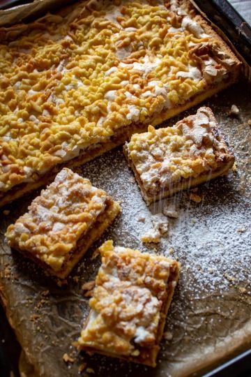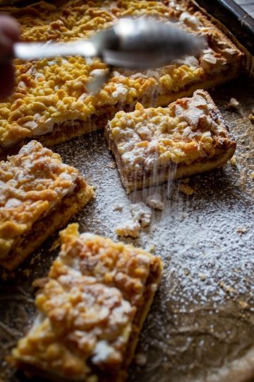 - Z mouky, hery, cukru krystal, pr. do pečiva a 4 žloutků vypracuj těsto. 2/3 těsta rozválej na placku a přendej na plech vyložený pečícím papírem. Zbylou 1/3 těsta nech vychladit v lednici min. 30 min.