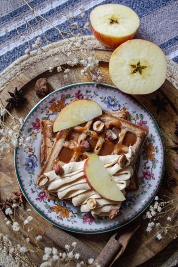 - Vafle ozdobte krémem, karamelem a praženými oříšky.