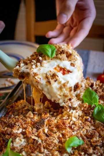 Tak a teď už to všechno jenom poskládáme dohromady. Dle velikosti zapékací nádoby si rozdělte lilky na 2–3 části a vrstvěte. Na dno nádoby trochu omáčky, na to lilky, část zbylých sýrů (mozzarella a Gran Moravia) a zase lilky. Nezapomeňte lilky vždy trochu prosolit. Každá část musí být pořádně ochucená! Poslední vrstvu uzavírají lilky. A teď vrchol ledovce! Na vrch navrstvěte všechnu omáčku mornay a celou ji zasypejte chlebovou drobenkou. Šoupněte do vyhřáté trouby a nechte zapékat přibližně 30 min. na 190 °C.