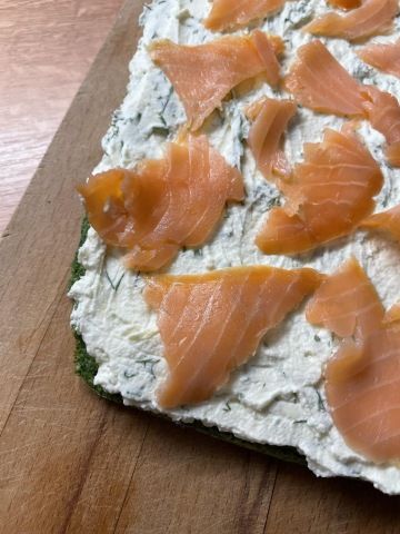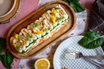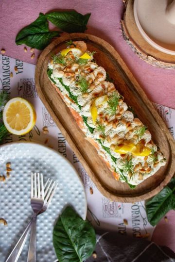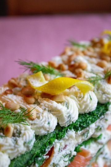- Teď už nám zbývá celou parádu jen poskládat. Vychladlý korpus si rozkrájejte na čtyři stejně široké pláty. Tři pláty nejlépe zdobícím pytlíkem rovnoměrně naplňte krémem, poklaďte lososem a složte na sebe. Čtvrtým plátem chlebíček završte a nazdobte zbylým krémem, bylinkami a praženými piniovými oříšky. Nechte vychladit v lednici alespoň pár hodin a podávejte jako předkrm nebo svačinku se skleničkou suchého bílého vína.