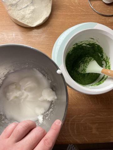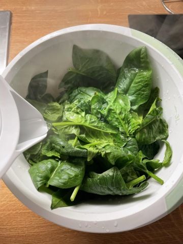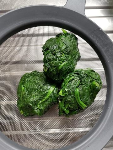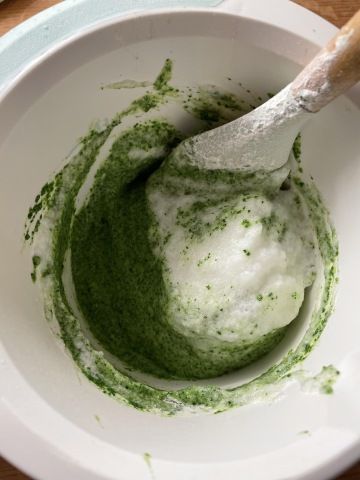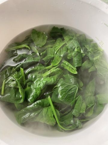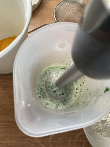 - Nejprve se pustíme do korpusu. Čerstvý špenát vypereme a zalijeme vroucí vodou. Necháme pár minut spařit, prudce zchladíme studenou vodou a následně z něj pořádně všechnu vodu vymačkáme. Zbude nám pár hrstiček špenátu, které rozmixujeme společně s mlékem.