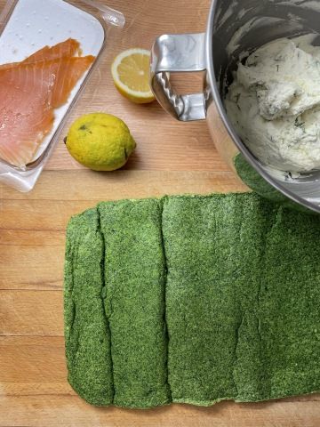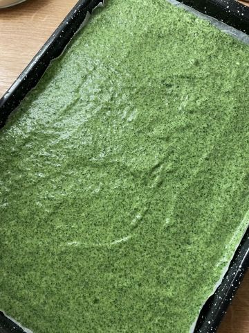 - Bílky vyšlehejte se špetkou soli do tuhého sněhu. Ten postupně velmi zlehka vmíchejte do špenátové směsi. Těsto dochuťte solí a pepřem. Připravte si plech s pečícím papírem a těsto na něj rozetřete. Pečte ve vyhřáté troubě na 180 °C přibližně 10–15 minut.