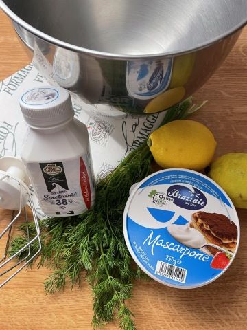 - Tak a jdeme na krém. Do šlehací nádoby dáme čerstvou smetanu, mascarpone, citronovou kůru a šťávu, sůl a pepř a začneme šlehat balónovou metlou nebo šlehačem. Krém je potřeba hlídat, abyste ho nepřešlehali. Smetana i mascarpone z La Formaggerie GM jsou parádní a krém byl hotový ani ne za 2 minuty. Pokud ho přešleháte, tak vám zřídne a zachrání to už jedině ztužovač. Po vyšlehání přidejte ke krému sekaný kopr a dochuťte solí, případně ještě citronovou šťávou. Já přidal ještě sekané kvašené citrony, ale být nemusí.